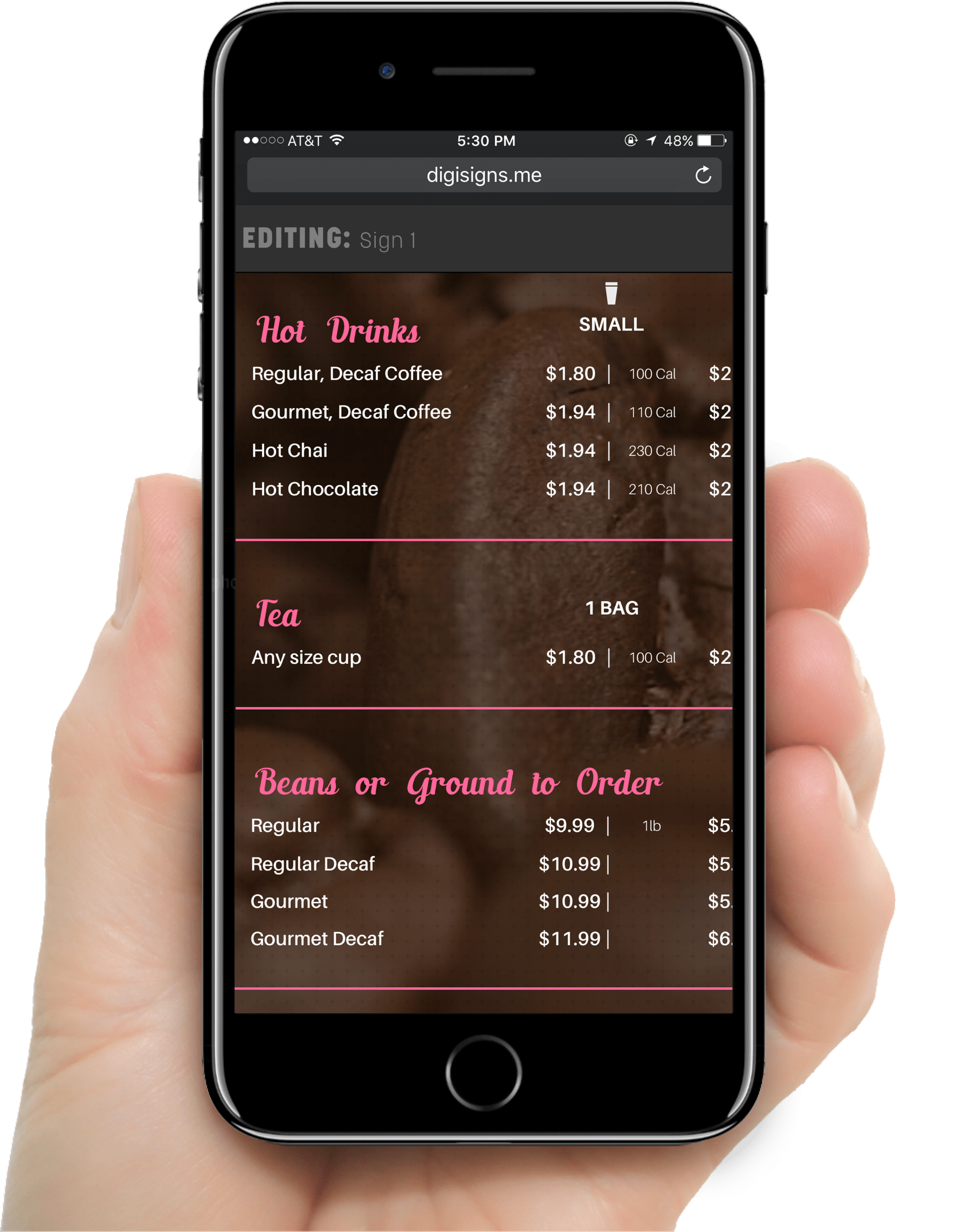 With Digi Signs, by Design Bus, outdated signs are a thing of the past. Our solution to digital signage allows users to easily add, remove, and update content on all your signs right from your smart phone. You can also restore, backup, save versions and schedule signs to show content between certain times. Published changes are seen in realtime and with internet, changes can be made remotely from anywhere to any sign.