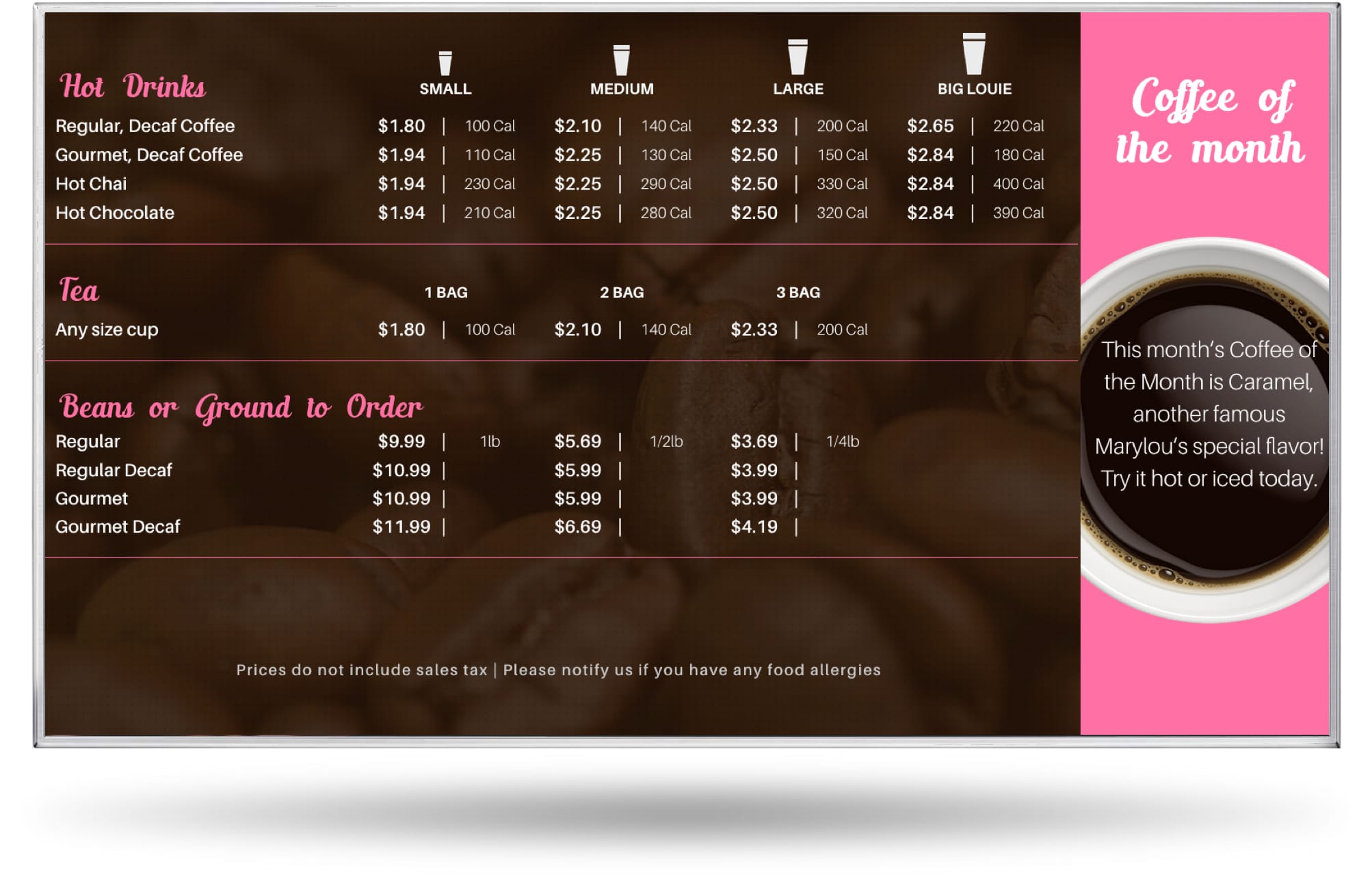 Whether you already have digital signage or are looking to upgrade, you'll be in good hands with us here at Design Bus. There are no contracts or hidden fees, installation is quick and our support is endless, so you'll never be on your own. Startup costs are minimal, and if you already have your own tv's, you're a step ahead.